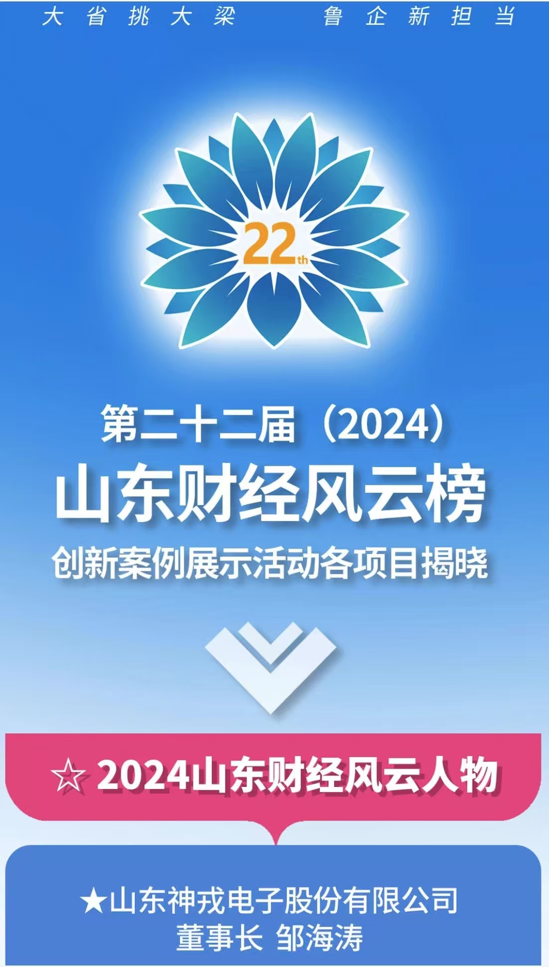 • 鄒海濤董事長榮獲“第二十二屆(2024)山東財經(jīng)風云人物”[ 更多 ]